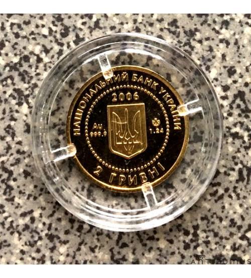 2 гривны. 2006. Золото 999,9. Вес 1,24 г. Диаметр 14 мм. Тираж 10 тыс. Монета в банковском состоянии – коробка, капсула, сертификат.